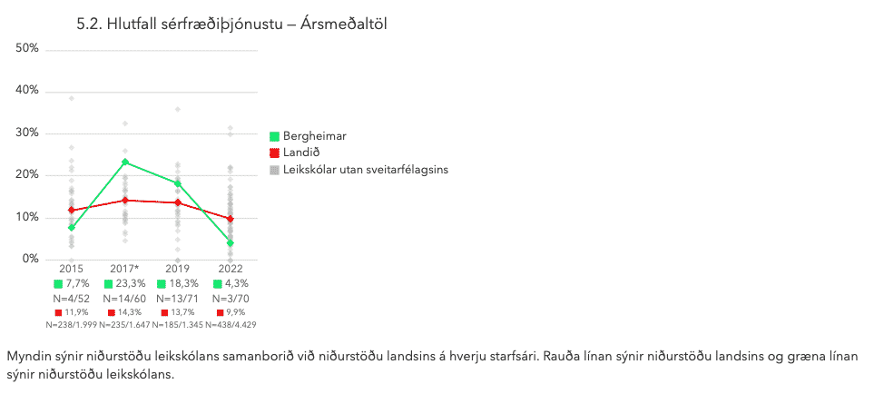 Hér fyrir neðan má, fyrir áhugasama, sjá brot af niðurstöðum úr könnuninni sem um ræðir. Könnunin er á vegum Skólapúlsins og er samræmd könnun sem gerð er reglulega meðal foreldra leikskólabarna. Foreldrar eru spurðir um ýmislegt er varðar leikskólann og niðurstöður bornar saman við fyrri ár og meðaltöl annarra leikskóla. Niðurstöður sýna svo ekki verður um villst aukna óánægju foreldra á nær öllum metnum þáttum síðan Hjalli tók við rekstri og það sem verra er, foreldrar meta ánægju barna sinna minni en áður. Niðurstöður sýna einnig að dregið hefur verulega úr hlutfalli stuðnings, sérkennslu og sérfræðiþjónustu auk þess sem hlutfall stoð -og sérfræðiþjónustu er talsvert minna hér en annarsstaðar. Þegar niðurstöður Bergheima eru bornar saman við meðaltöl annarra leikskóla er ánægja foreldra á Bergheimum langt undir meðallagi á flestum sviðum. Svarhlutfall var rúmlega 82%.