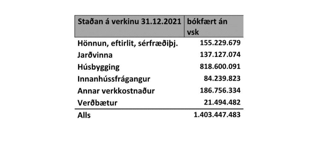 Staðan á verkinu 31.12.2021 bókfært án vsk: