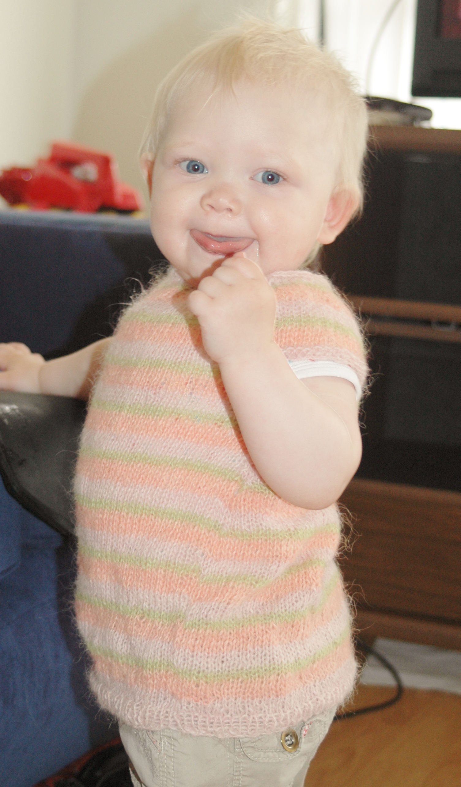 Þá var bara að finna sér eitthvað fallegt að prjóna úr Þingborgarbandinu. Eftir nokkrar tilraunir og upprekingar ákvað ég að gera stutterma skokk handa Þórunni Erlu litlu stelpunni minni. Svo þegar kjóllinn var tilbúinn til notkunar var greinilegt að mamman hélt að litla stelpan sín væri ennþá pinku ponsu kríli. Kjóllinn svokallaði var stuttermabolur á henni! Ég geri líklega ekki nógu mikið af því að mæla prjónfestu, enda lítið gaman af svoleiðis veseni 🙂