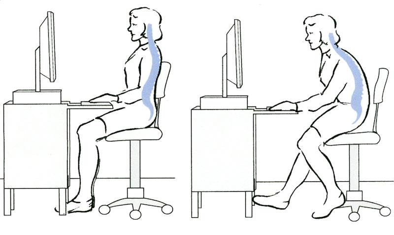Það er mjög mikilvægt að velja góðan stól ef setið er við vinnu. Það þarf að vera hægt að stilla stólhæð, -halla, -bak og arma. Þá er einnig mikilvægt að læra á og nýta sér stillimöguleikana, ekki bara í upphafi heldur yfirfara reglulega stillingarnar. Ef möguleiki er til staðar þá er langbest að hafa hækkanlegt og lækkanlegt borð svo hægt sé að velja hvort staðið eða setið er við vinnu. Góð þumalputtaregla við sitjandi vinnu er að standa upp á 30 mín fresti.