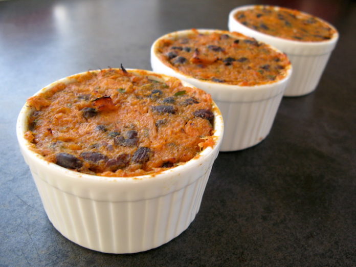 8. Nú hafið þið um tvennt að velja, a) annað hvort að setja stöppuna með öllum kryddunum og baununum í margar litlar skálar eins og ég gerði b) eða þá að setja bara allt í miðlungsstórt eldfast form. Ílátið skiptir ekki öllu máli, þetta snýst meira um útlitið.