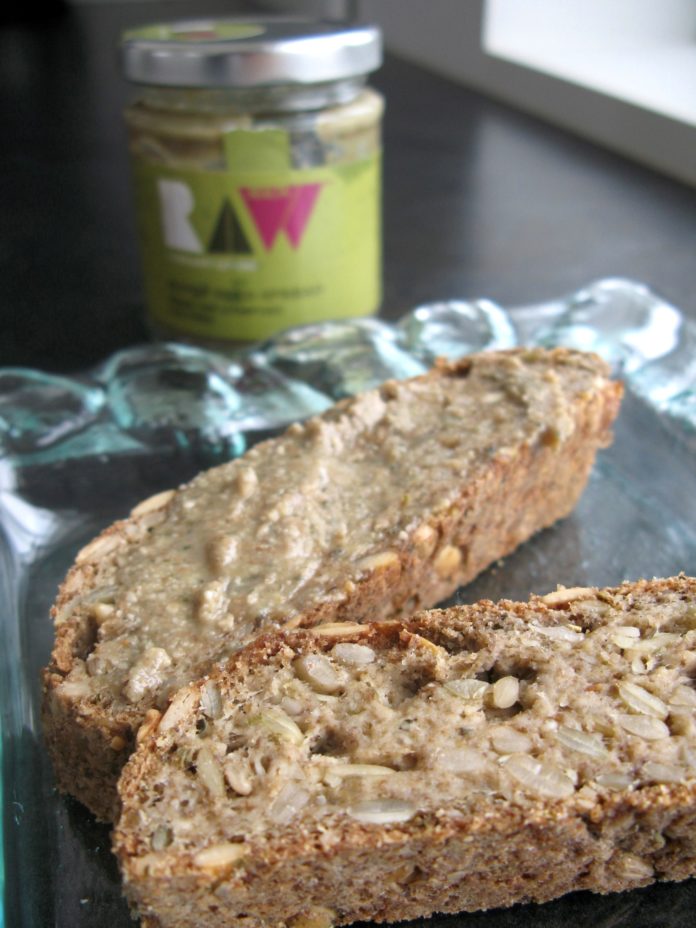 7. Látið brauðið kólna aðeins áður en það er skorið. Ég mæli svo með því að setja annað hvort heimatilbúið guacamole á brauðið eða þá Raw Superseed Spread frá Biona. Já, eða bara smjör og ost eins og eiginmaður minn gerir 🙂