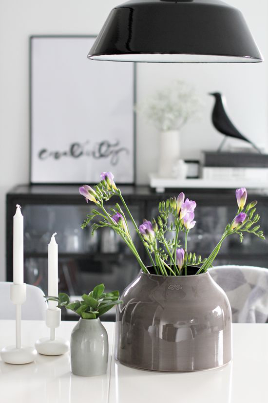 Uppáhalds lífsstíls- og heimilisbloggarinn minn er með svipaðan stíl og það er unaðslegt að skoða bloggið hennar og myndirnar. Þar er líka alltaf hægt að fá fullt af frábærum hugmyndum, takið t.d. eftir skórekkanum sem er auðveldlega hægt að útbúa úr handklæðaslá eða gardínustöng. Svo er hún nýbúin að útbúa fataherbergi sem flestar konur dreymir um, öll smáatriði og stílesering á hreinu. Þið sjáið líka hvað blóm geta gert mikið fyrir rými sem eru svolítið svarthvít, enda alltaf gaman að vera með blóm í sínu nánasta umhverfi. Hér er brot af því besta frá henni og ef þið viljið kynna ykkur bloggið hennar þá er það hér.