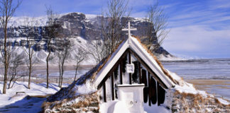 Maður í mislitum sokkum undir Eyjafjöllunum