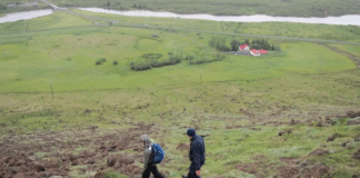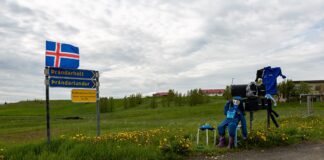Maður í mislitum sokkum undir Eyjafjöllunum