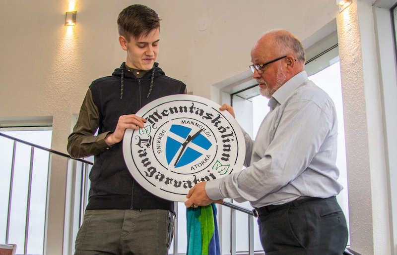 Halldór Páll Halldórsson, skólameistari, tók við gjöfinni við mikinn fögnuð viðstaddra. Halldór Páll þakkaði Þórarni hlýhug í garð skólans og kvað klukkunni verða fundinn staður við hæfi.