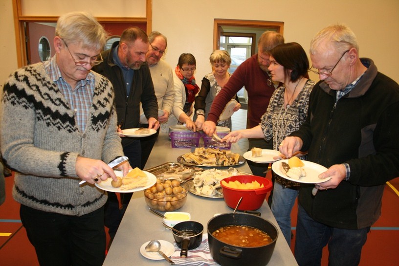Á borðum var þjóðlegt sjávarfang sem veitt var af vinum Hjallastefnunnar og síðan verkað á athafnasvæðinu við Félagsheimilið Stað á síðustu mánuðum. Um er að ræða siginn fisk sem hangið hefur néðan í útsýnispallinum á Stað við hinar bestu aðstæður. Einnig saltaður þorskur og langa sem flött voru á Aldamáthátíðinni við Stað og síðan sólþurrkað þar í framhaldinu.