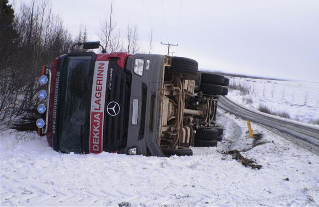 Vörubifreið með tengivagni valt síðastliðinn fimmtudag á Laugarvatnsvegi við Böðmóðsstaði. Ökumaður slasaðist minni háttar. Hálka var á veginum þegar slysið átti sér stað. Ökumaður var að víkja undan vörubifreið sem kom á móti en ökumaður þeirrar bifreiðar hafði ekki fulla stjórn á henni í hálkunni. Bifreiðin sem valt var fulllestuð og skemmdist töluvert.