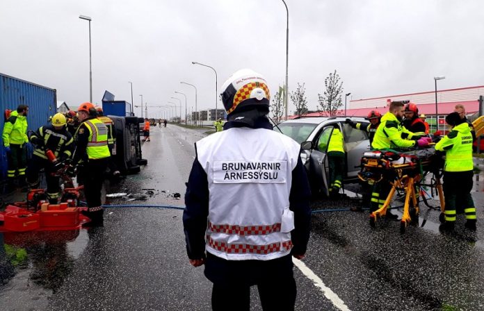 Þá rákust saman tveir bílar á Eyravegi á Selfossi, þegar bifreið var ekið út frá bílastæði Húsasmiðjunnar í veg fyrir bíl sem ók um Eyraveginn. Sá bíll valt við áreksturinn.