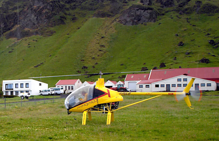 Franskur flugmaður, sem ætlar að fljúga í kringum hnöttinn á fisþyrlu, lenti í gærkvöldi á túninu við Eystri-Pétursey í Mýrdalshreppi.