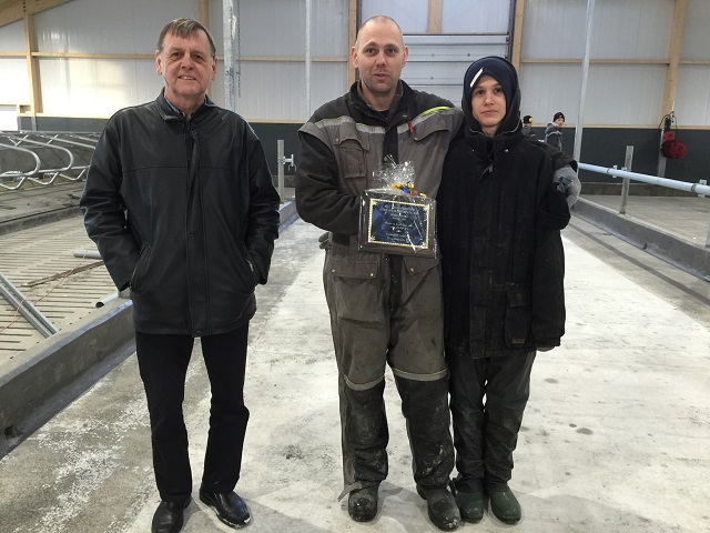 Á myndinni má sjá Birkir Arnar og son hans, Róbert Bjarma, með plattann ásamt Ágústi Inga Ólafssyni, skrifstofustjóra Rangárþings eystra