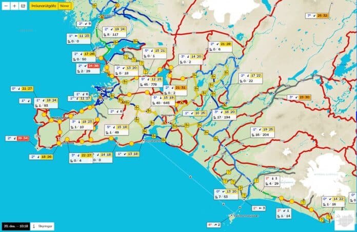 „Þar eru allar línur tepptar af fólki að spyrja um færð, veður og lokanir vega. Fólk er vinsamlega beðið um að hringja alls ekki í Neyðarlínuna til að spyrja að þessum hlutum. Allar upplýsingar um lokanir vega og hugsanlegar opnanir er að finna á umferdin.is,“ segir í tilkynningu frá Vegagerðinni.