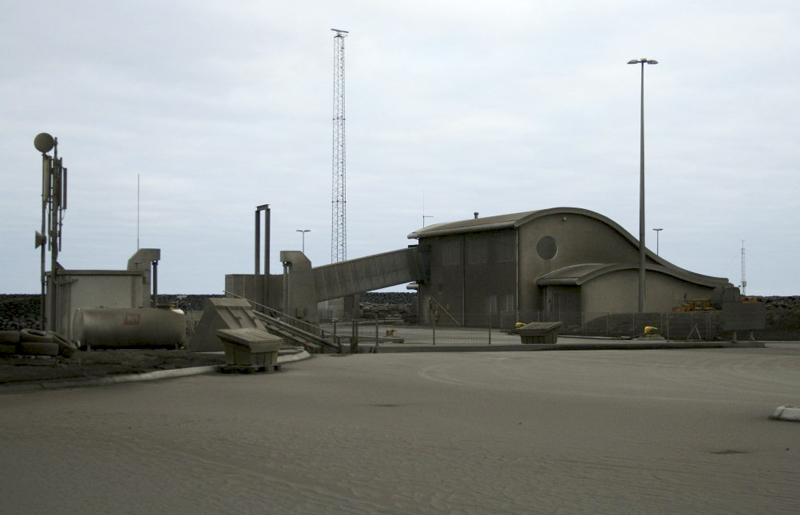 Mannvirkin í Landeyjahöfn eru eins og í draugabæ eftir sand- og öskufokið í síðustu viku. Tvö skip vinna nú við dýpkun í höfninni sem hefur verið lokuð frá því í nóvember.