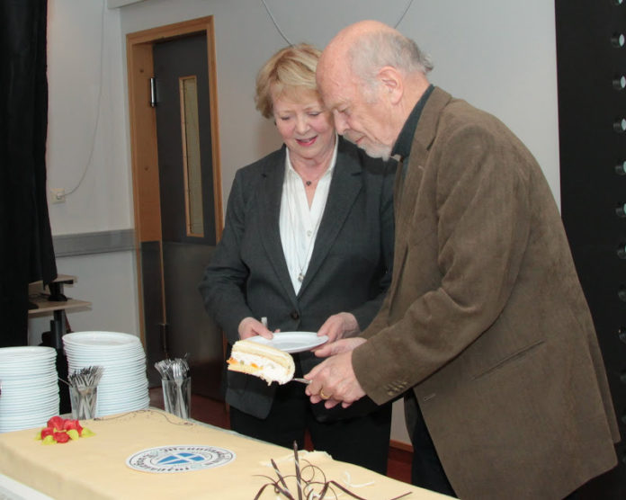 Formlegri dagskrá lauk með því að Árni Bergmann skar væna sneið af risastórri afmælistertunni fyrir Frú Vigdísi. Það var Aðalbjörg Bragadóttir, kennari við skólann, sem stýrði athöfninni.