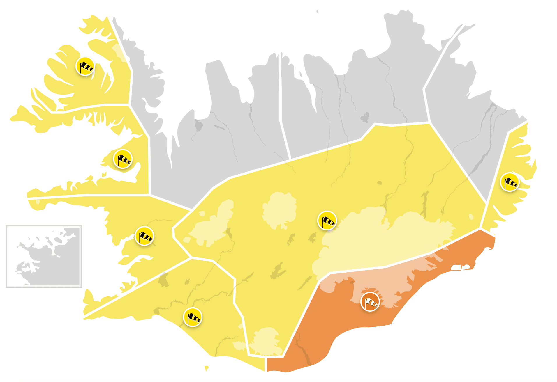 Gul viðvörun er einnig í gildi á Suðurlandi frá klukkan 6 á mánudagsmorgun, til klukkan 9 á þriðjudagsmorgun. Hvassast verður undir Eyjafjöllum, vindhviður allt að 30 m/sek og varasamt að vera á ferðinni á ökutækjum sem taka á sig mikinn vind.