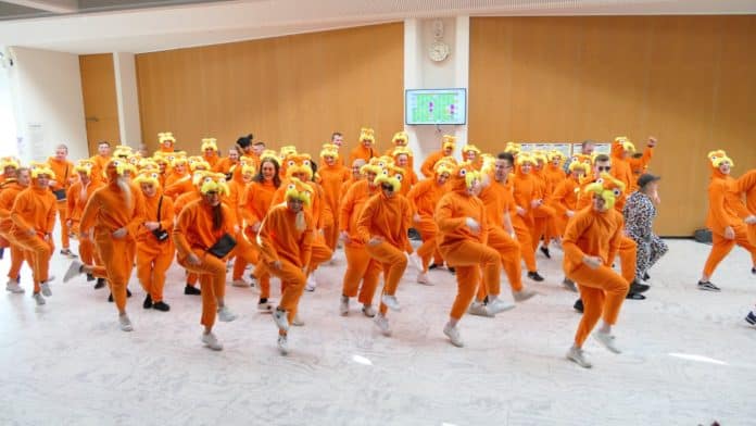 Fjölbrautaskóli Suðurlands fylltist í morgun af dansandi appelsínugulum fyrirbærum. Þar voru á ferð dimmitantar, nemendur sem stefna á að ljúka námi á vorönn.