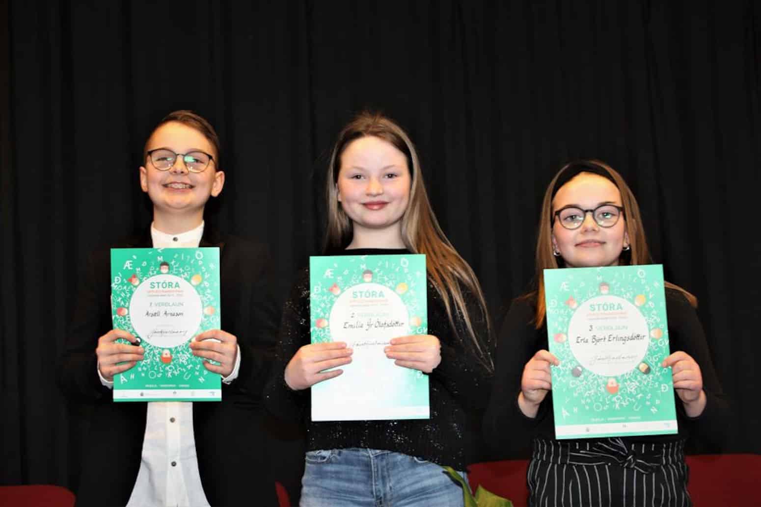 Veitt voru verðlaun fyrir þrjú efstu sætin og hafnaði Ársæll Árnason úr Sunnulækjarskóla í 1. sæti, Emilía Ýr Ólafsdóttir í 2. sæti og Erla Björt Erlingsdóttir í 3. sæti en þær eru báðar úr Grunnskólanum í Hveragerði.