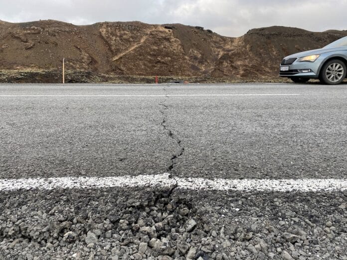 Við skoðun í morgun komu í ljós nýjar sprungur og hefur sigið aðeins meira á þeim stöðum sem vegurinn hafði sigið áður.