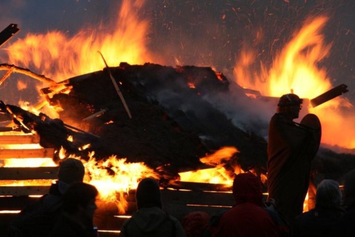 Í kvöld var sviðsettur aðdragandi Njálsbrennu og að endingu var Bergþórshvoll brenndur til grunna en hann hafði verið reistur hjá Sögusetrinu á Hvolsvelli.