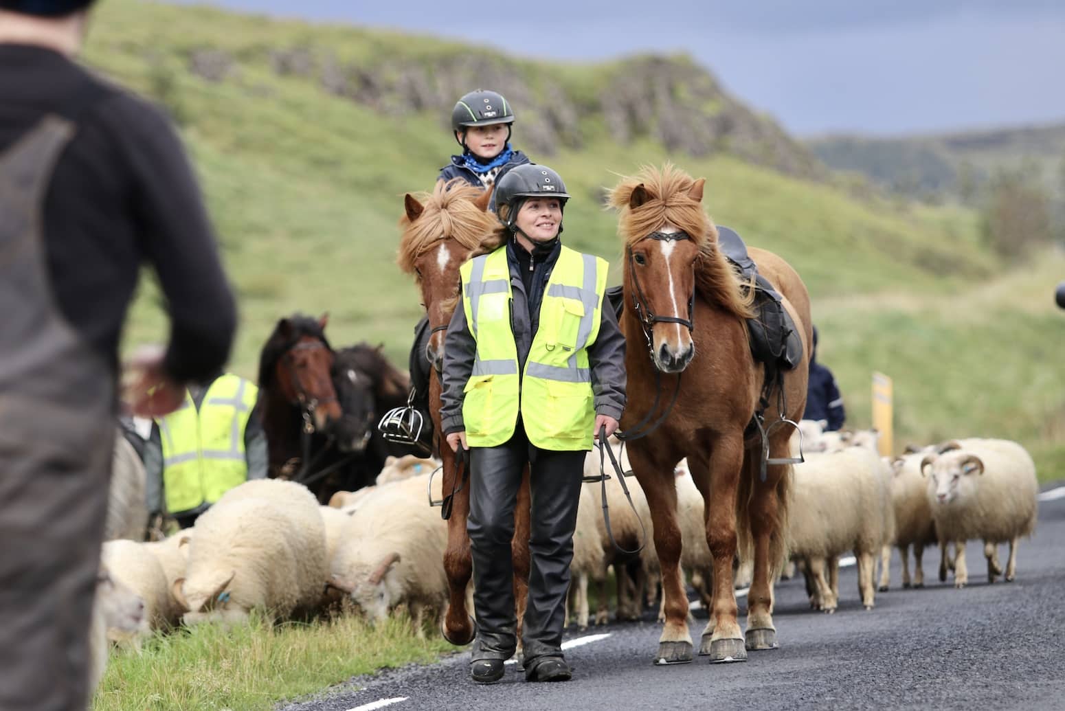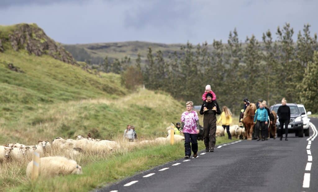 Þrátt fyrir að minna væri af fólki en fé í Hrunaréttum í morgun heppnaðist dagurinn vel, enda er hann að margra mati besti dagur ársins. Sunnlenska.is rakst á Hrepphólabændur síðdegis í dag þar sem þeir ráku safnið heim meðfram Miðfelli.