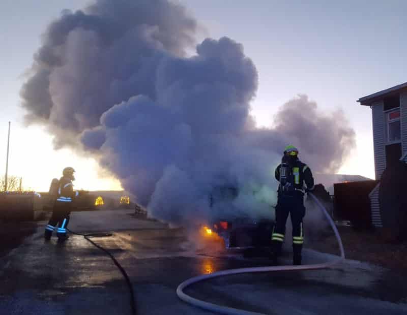 Hins vegar var annar bíll í hættu en slökkviliðsmönnum tókst með snarræði að forða honum undan eldinum og urðu aðeins smávægilegar skemmdir á þeim bíl.