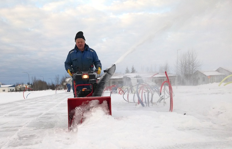 Birgir Óskarsson tók sig vel út á snjóblásaranum í dag þar sem hann blés snjó af grunnplötu raðhúsalengjunnar sem verið er að byggja við Sólbakka á Hvolsvelli.
