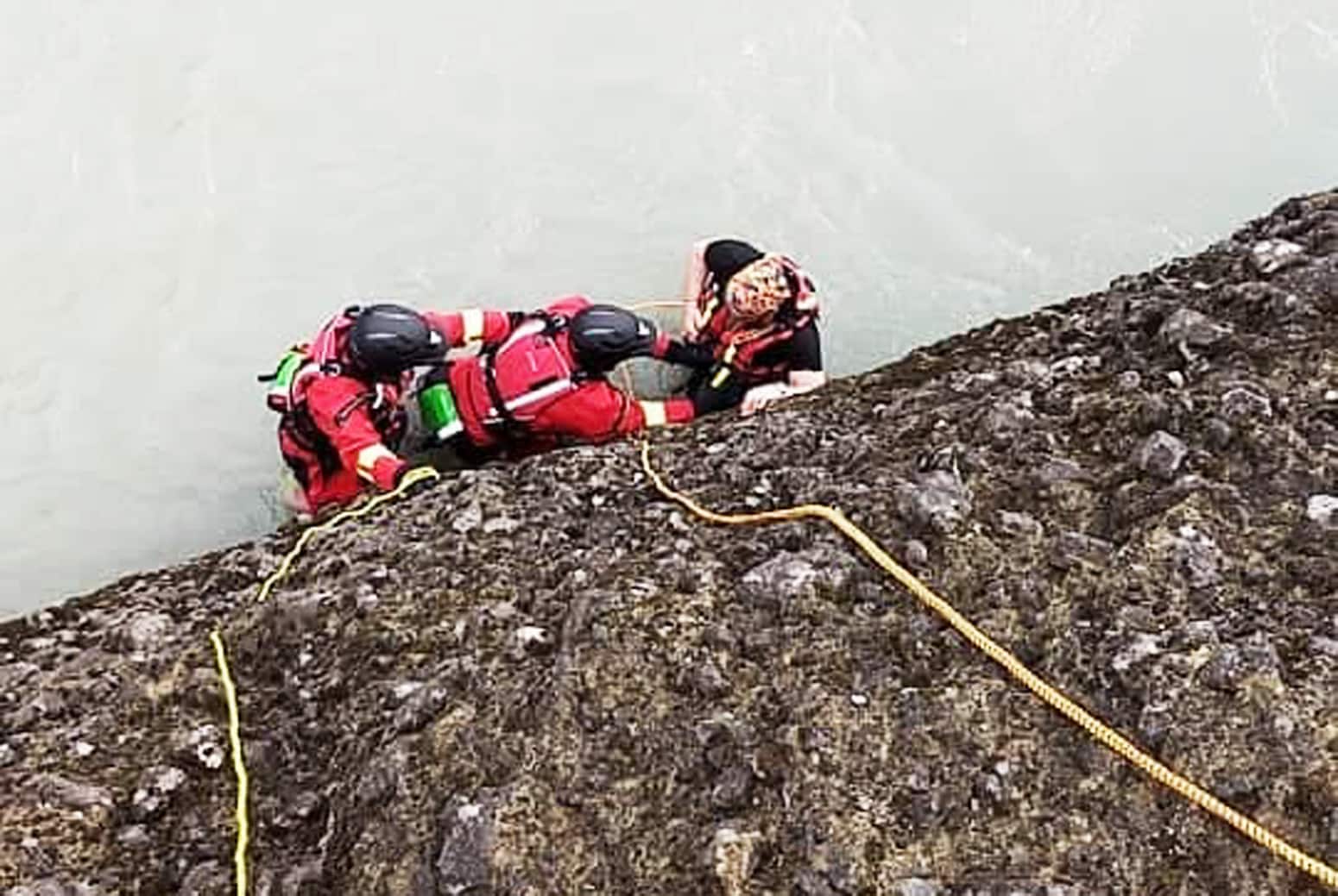 Fjórir hópar björgunarsveitarfólks lögðu af stað á vettvang og sá fyrsti sem kom að manninum náði fljótt að koma til hans línu og björgunarvesti. Um hálftíma síðar var maðurinn komin á þurrt í sjúkrabíl til aðhlynningar.