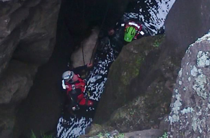 Vitni voru að því þegar kindin féll í gjána sem var botnfull af djúpu vatni. Kindin náði að krafla sig upp á syllu en þegar björgunarsveitarmenn sigu niður í gjána stökk kindin til sunds og svamlaði inneftir gjánni. Einn björgunarmannanna þurfti því að synda á eftir kindinni og var hún handsömuð og færð aftur upp á sylluna.