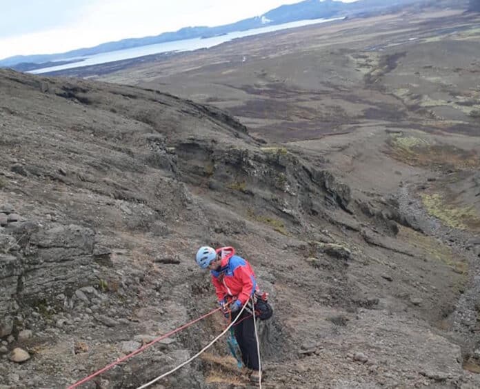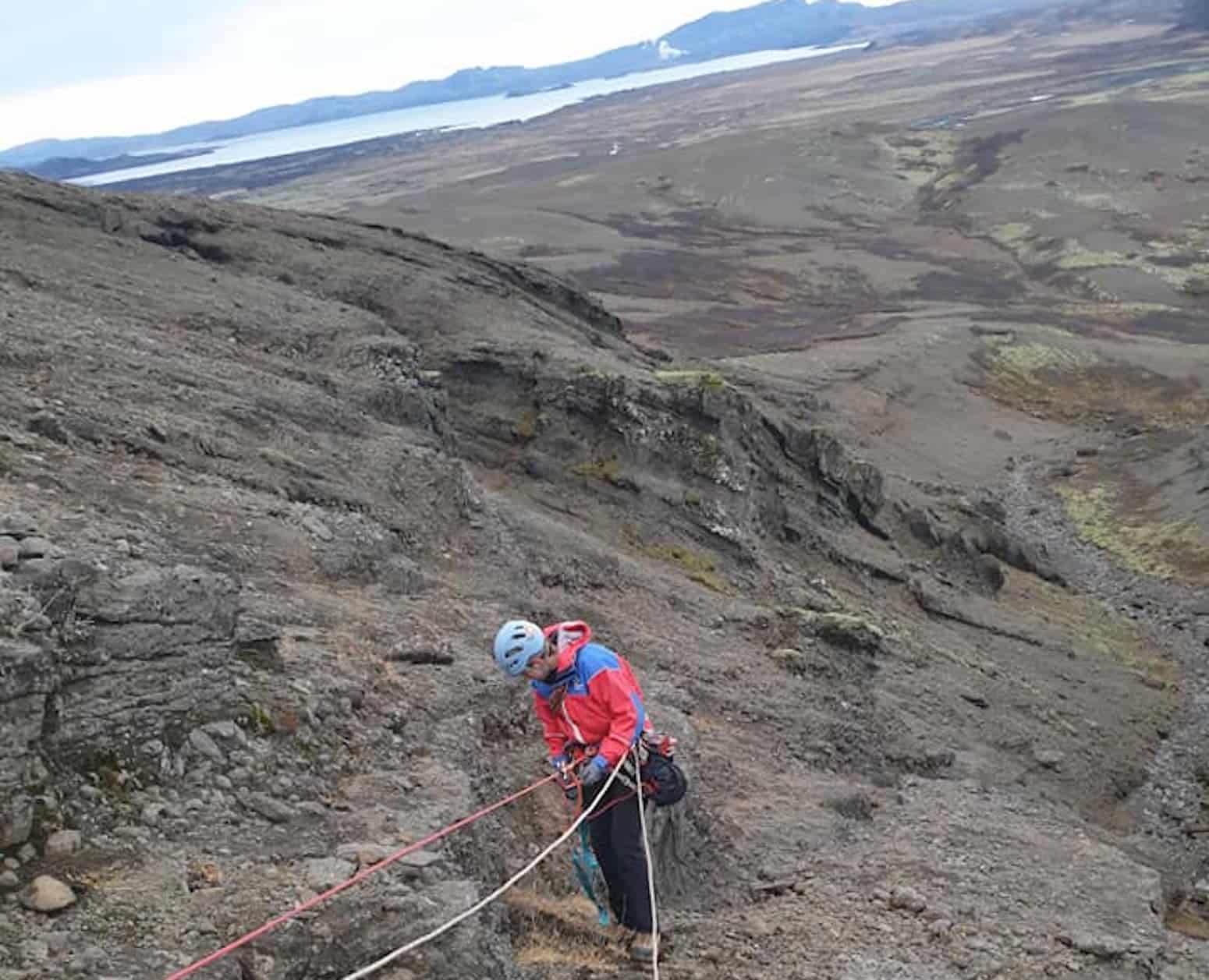 Erfitt var að koma fyrir tryggingum til að hægt væri að síga að fénu í gilinu en að lokum fundust sprungur sem hægt var að berja fleyga í.