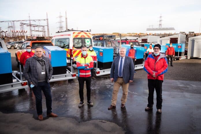 Sigurður Ingi Jóhannsson, samgöngu- og sveitarstjórnarráðherra, færði í dag fulltrúum þrettán björgunarsveita Slysavarnafélagsins Landsbjargar nýjar færanlegar rafstöðvar við athöfn í húsakynnum Neyðarlínunnar á Hólmsheiði.