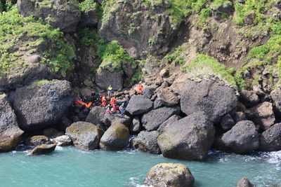 UPPFÆRT KL. 14:00: Konan sem féll í Básnum í Víkurfjöru er komin um borð í þyrlu. Björgunarmenn óðu í sjó meðfram klettunum og klifruðu svo upp að konunni og gátu tekið á móti siglínu þyrlunnar.
