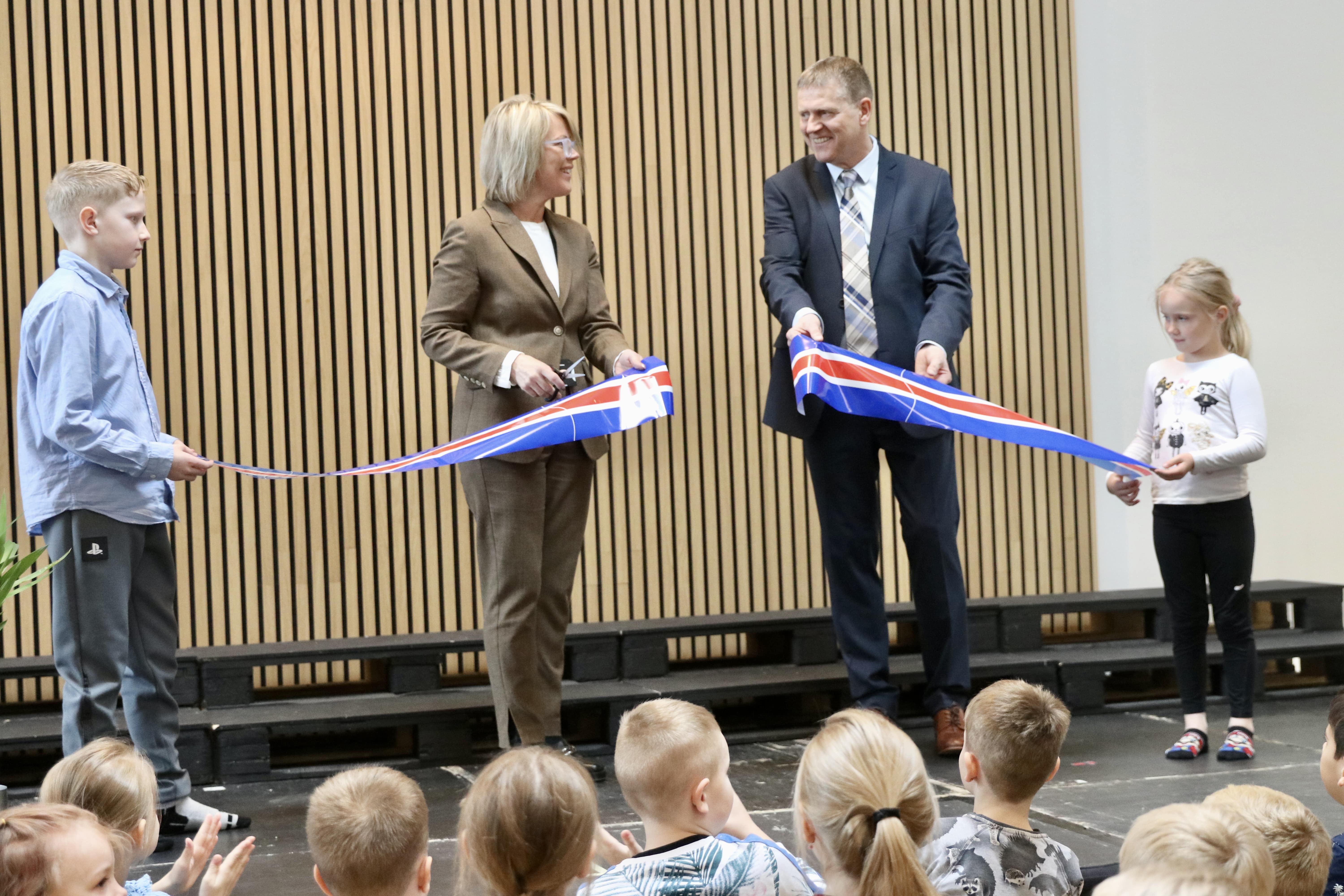 Fjóla St. Kristinsdóttir, bæjarstjóri, klippti á borða ásamt Hilmari til að vígja húsnæðið og nutu þau aðstoðar yngsta og elsta nemanda skólans, Elmu Eir Styrmisdóttur og Svavars Orra Arngrímssonar. Gríðarleg fagnaðarlæti brutust út að lokinni borðaklippingunni.