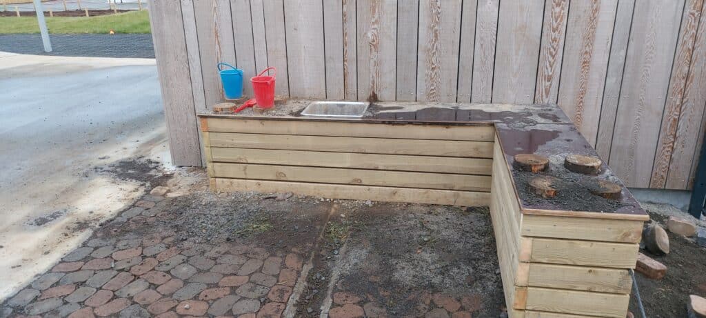 „Náttúrulegur efniviður og frjáls leikur með hugmyndaflug barnanna að vopni var áherslupunktur leikskólastarfsmanna sem var ánægulegt að vinna með og útfæra. Náttúruleikurinn er byggður upp með efnivið úr nærliggjandi skógrækt sem og tilfallandi grjóti af svæðinu. Útkoman er kofa og stiklusvæði upp við drullusvæði með rennandi vatni. Malarstígur hlykkjast umhverfis svæðið og snertir á fjölbreyttum gróðursvæðum og misopnum rýmum sem gefa möguleika á stórum hópleikjum jafnt sem smærri kyrrðarsvæðum og snertingu við náttúrulegri efni. Hliðarspor frá stígnum liggja einnig að svæði innblásið af íslenskum fjárréttum og sleðabrekkunni sem gefur einnig gott útsýni,“ segja þau Aðalheiður E. Kristjánsdóttir og Jóhann Pétursson, landslagsarkitektar hjá Landmótun, en hönnun útisvæðisins var í þeirra höndum ásamt Huldu Davíðsdóttur og Írisi Reynisdóttur. Hugmyndir starfsfólks leikskólans voru hafðar til hliðsjónar við alla hönnun, enda þótti hönnunarhópnum mikilvægt að fá skoðanir þeirra í ljós og fylgja því eftir.