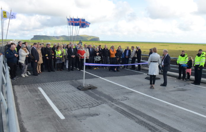 Innanríkisráðherra, Hanna Birna Kristjánsdóttir, klippti á borða á nýrri brú yfir Múlakvísl með aðstoð Hreins Haraldssonar vegamálastjóra í dag. Hin 160 m langa brú var þannig formlega tekin í notkun.