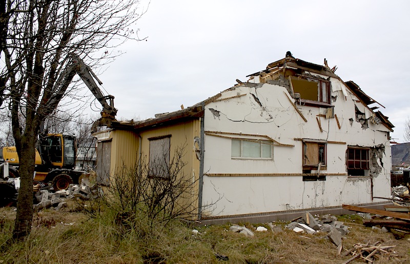 Stórvirkar vinnuvélar hafa í vikunni unnið að niðurrifi húsa í mjólkurbúshverfinu á Selfossi. Í morgun var verið að rífa húsið Snæland, sem á sér um margt merkilega sögu í uppbyggingu byggðarinnar á Selfossi.