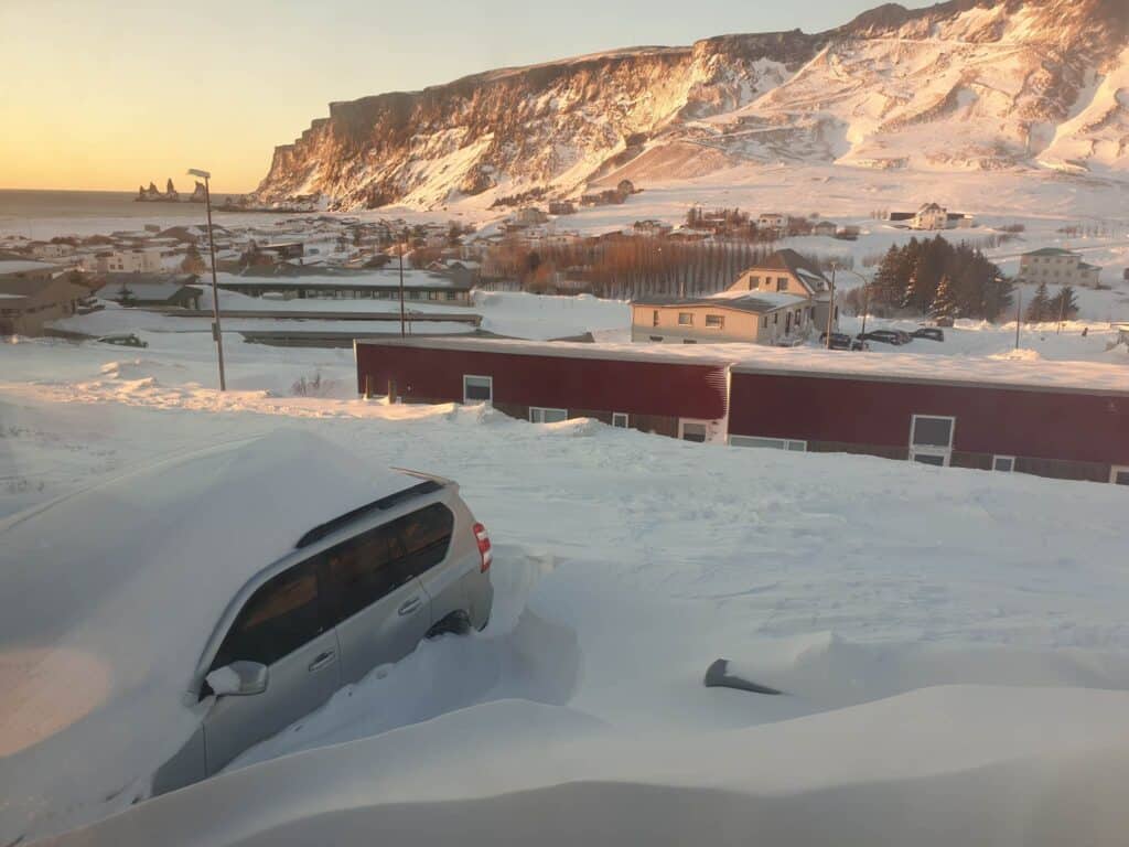 Það er fallegt í Vík í dag en gríðarlegt fannfergi. Að sögn Sigurðar Hjálmarssonar, sem tók myndirnar með þessar frétt eru rúmlega tuttugu ár síðan annar eins snjór var á svæðinu, í febrúar árið 2001.