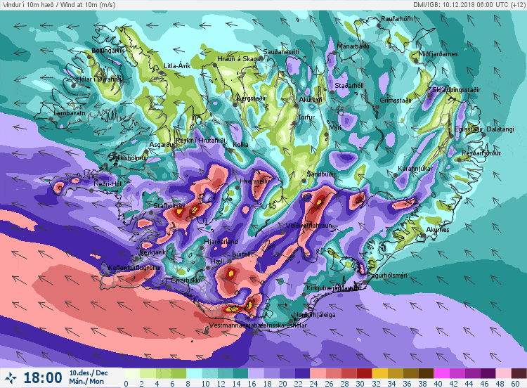 Suðvestanlands er spáð 20-25 m/sek síðdegis og mun veðrið ná hámarki um kl. 19. Undir Eyjafjöllum verða hviður allt að 45 m/sek milli klukkan 16 og 21.