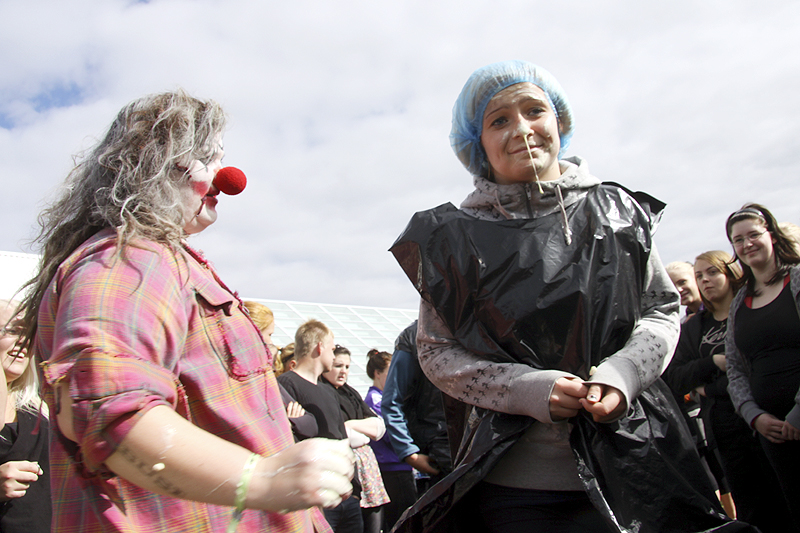 Busavígslan í Fjölbrautaskóla Suðurlands fór fram núna í hádeginu þar sem óhugnalegir trúðar og aðrir vitfirringar meðhöndluðu nýnemana.