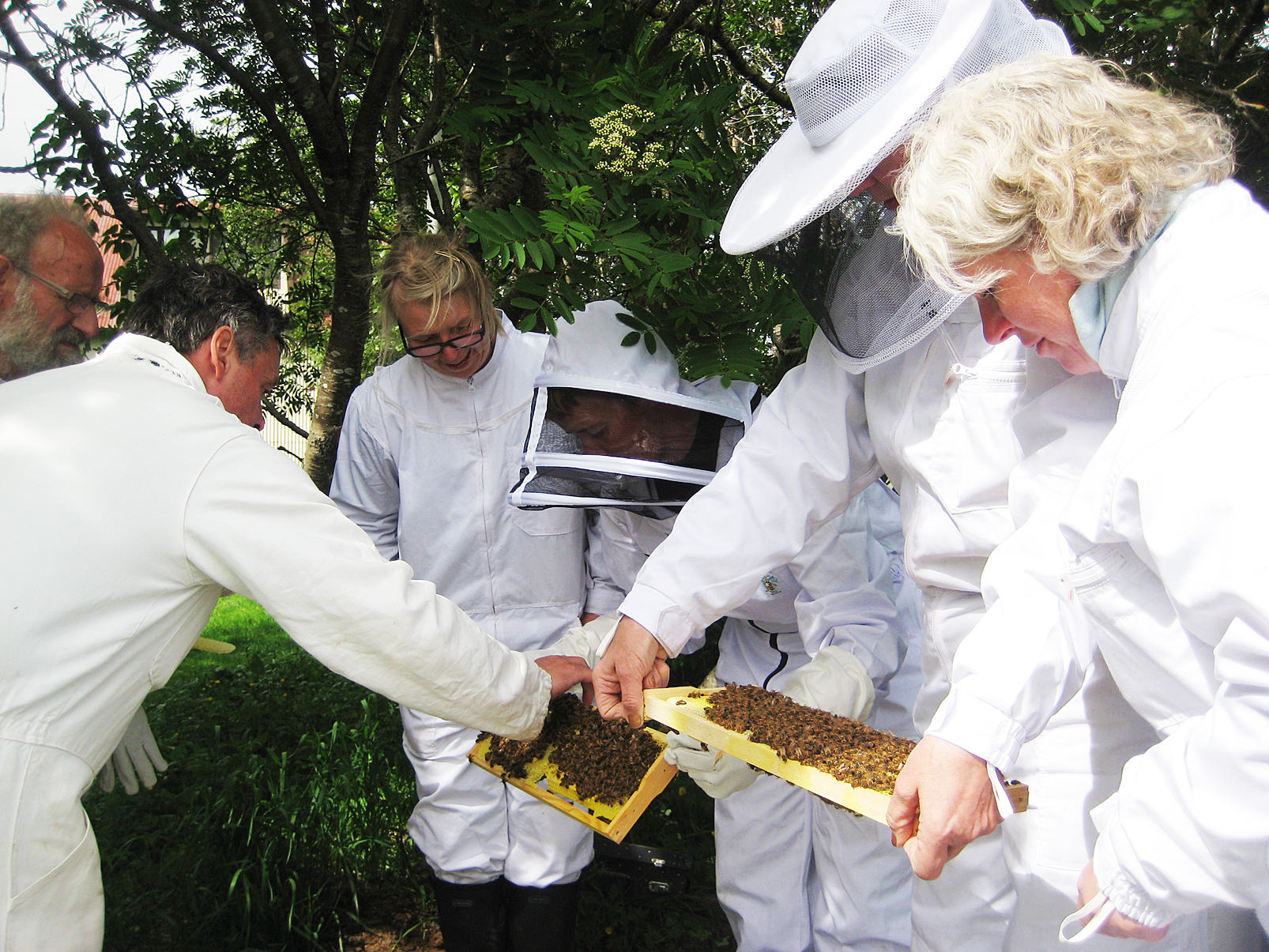 Með Agli í för voru líka þær Ásthildur Magnúsdóttir og Herborg Pálsdóttir, báðar frá Selfossi, og nýgræðingar í býflugnarækt líkt og húsráðendur á Húsatóftum. Þær eru mjög spenntar fyrir býflugnaræktinni en aðspurðar hvort ekki væri erfitt að vera með bú í þéttbýli sögðu þær svo alls ekki vera. Tíu ára reynsla væri af slíku í Reykjavík án nokkurra kvartana og þær hefðu gætt þess að kynna fyrirætlanir vel fyrir nágrönnum sínum.