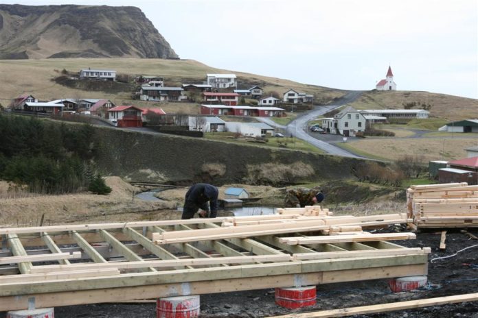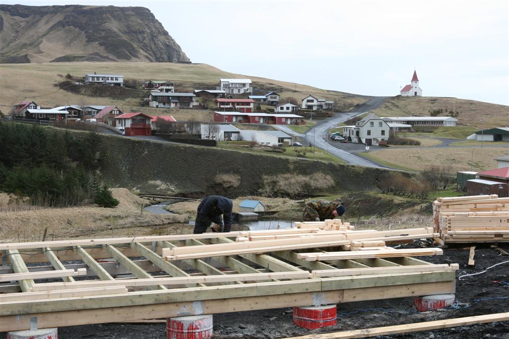 Nokkur hús hafa risið í Vík á síðustu mánuðum en á myndinni, sem tekin var í morgun, er Finnur Bárðarson að byggja sér heilsárshús rétt við hliðina á æskuheimili sínu.