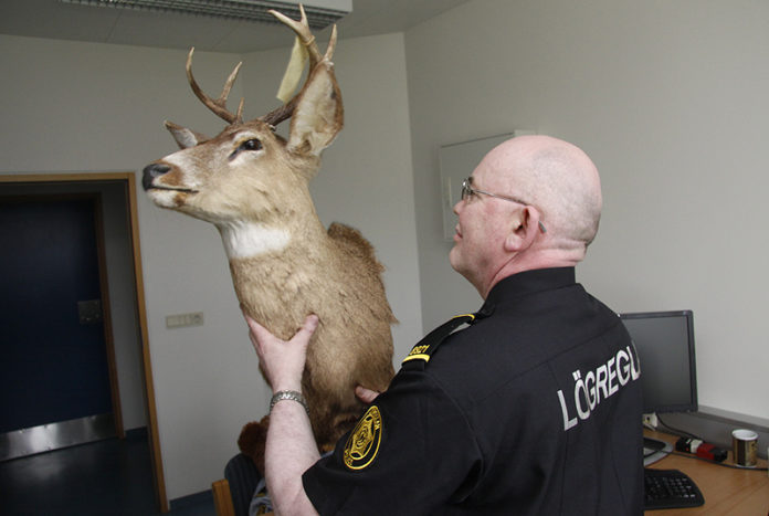 Lögreglan á höfuðborgarsvæðinu stöðvaði menn í bíl á dögunum og höfðu þeir í fórum sínum framhlaðning og dádýrshaus. Framhlaðningurinn var haldlagður en mennirnir sögðust eiga hausinn og höfðu hann á brott með sér aftur.