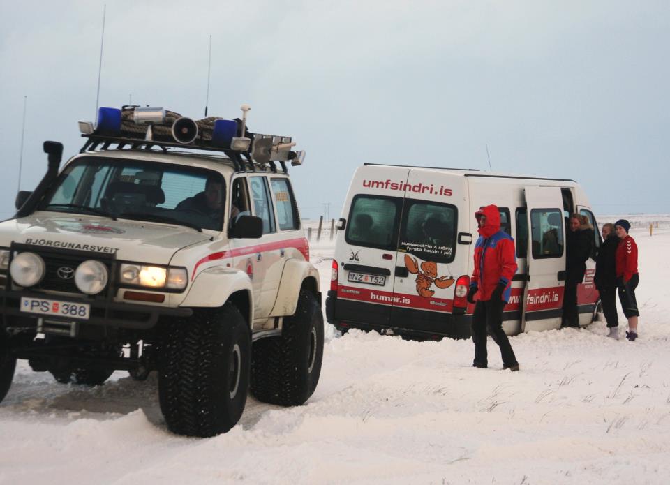 Félagar úr Björgunarsveitinni Dagrenningu á Hvolsvelli höfðu þá dregið rútuna upp á veg og gert við smáskemmdir á henni inn á gólfi í húsi sveitarinnar.