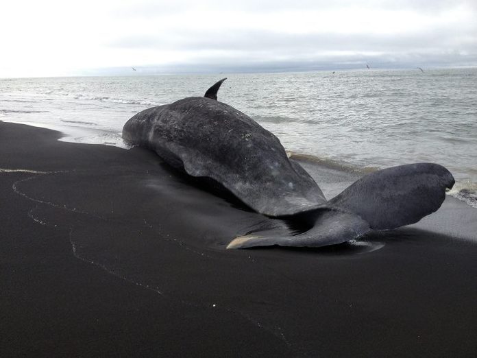 Um fimmtán metra langt búrhvalshræ fannst í Bakkafjöru, skammt vestan við Landeyjahöfn, í síðustu viku. Mikinn óþef leggur frá hræinu sem hefur líklega velkst lengi í sjónum áður en það rak á land.