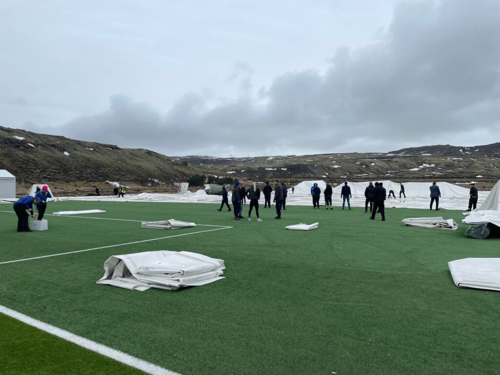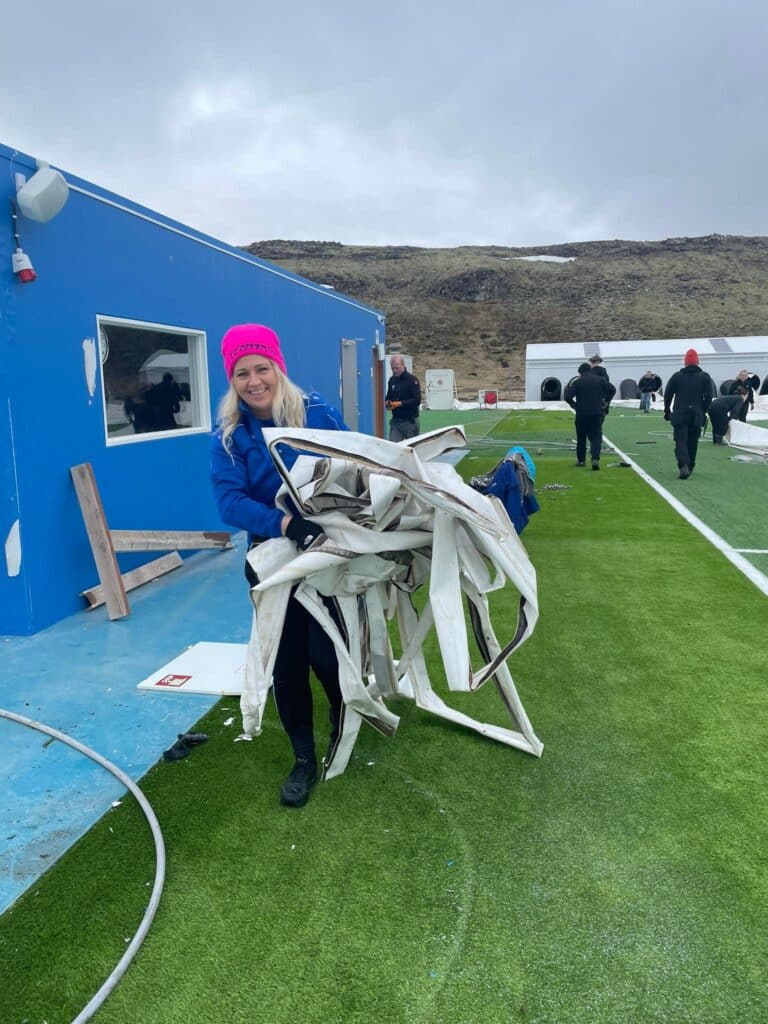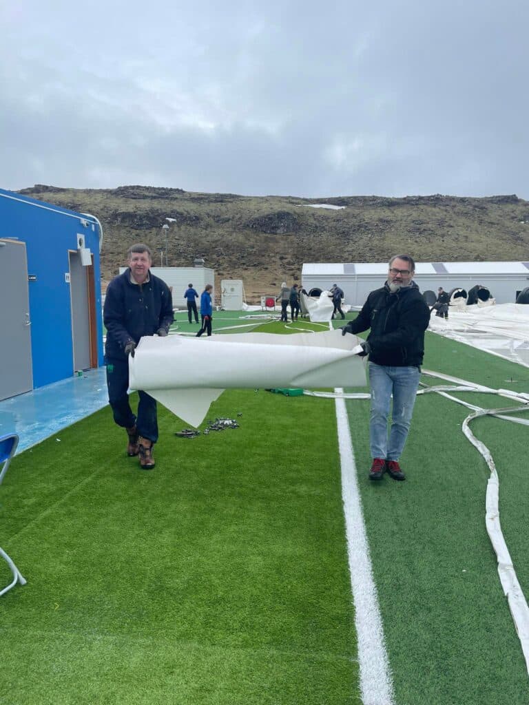 Það var góð stemning hjá sjálfboðaliðunum í dag sem unnu verkið með bros á vör og í framhaldinu getur knattspyrnudeild Hamars hafið æfingar á gervigrasinu sem var inni í höllinni.