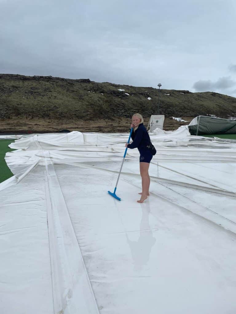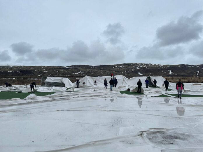 Verkefni dagsins var að fjarlægja dúkinn af sökklinum en Sjóvá, tryggingafélag Hveragerðisbæjar, eftirlét Hamri dúkinn til þess að nota í fjáröflun.
