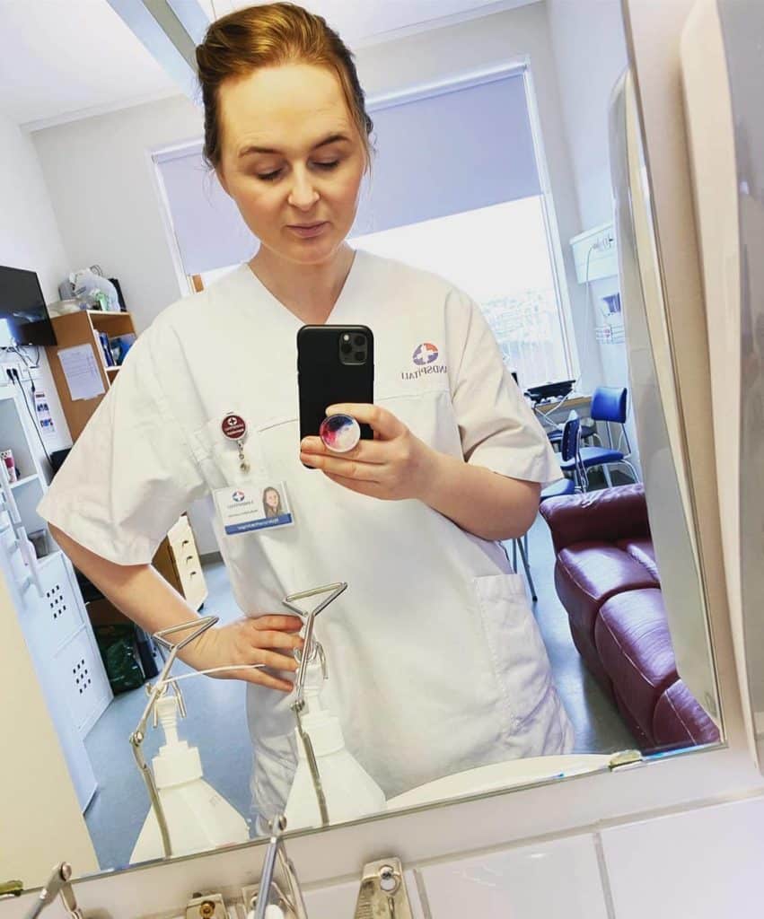 „Ég fékk frábærar móttökur á LSH, allir voru svo þakklátir og ánægðir. Mér sýnist líka á öllu að ég sé að koma inn á frábæra deild með góðu fólki. Ég er auðvitað búin að vera í burtu frá faginu í svolítinn tíma en fagmennskan og öryggið er sett framar öllu. Ég er búin að vera á fullu að lesa mér til og horfa á fyrirlestra í námskerfinu þeirra svo að ég sé örugglega með alla verkferla á hreinu. Sjálf hjúkrunin er mér í blóð borin og mér fannst ég pínu vera komin heim.“