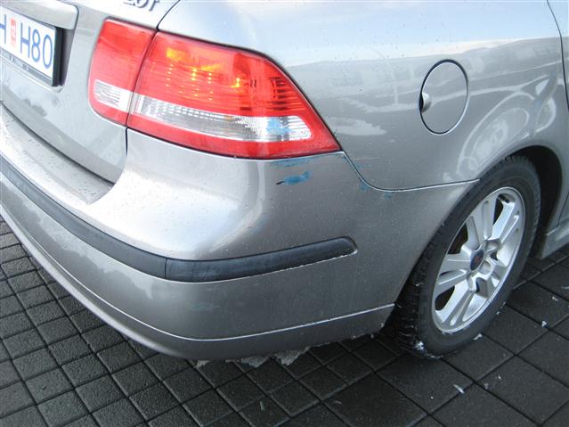 Skemmdir eru á hægra afturbretti Saab bifreiðarinnar. Ljóst er að bifreiðin sem hefur farið utan í hefur verið ljósblá að lit.