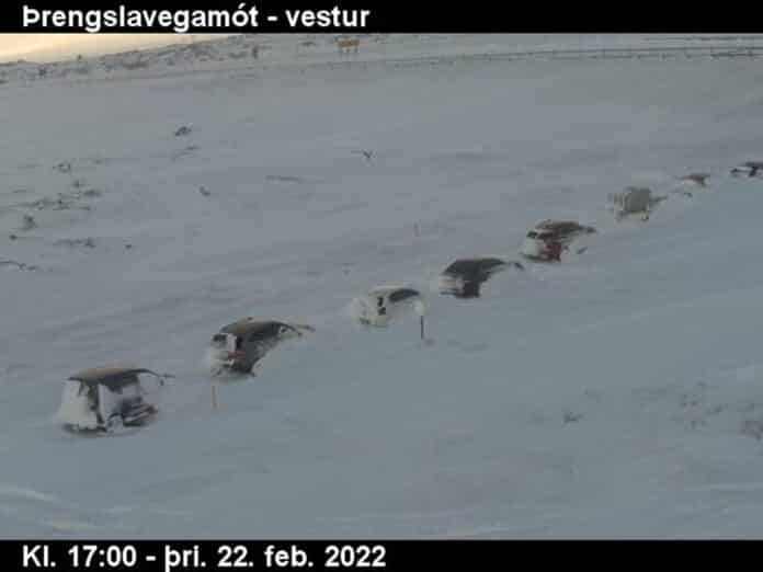 Tugir bíla voru fastir á Þrengslavegi og í Svínahrauninu í gærkvöldi og er útlit fyrir að það muni taka langan tíma að greiða úr röðinni og þegar því er lokið þá er hægt að hefja mokstur á nýjan leik.