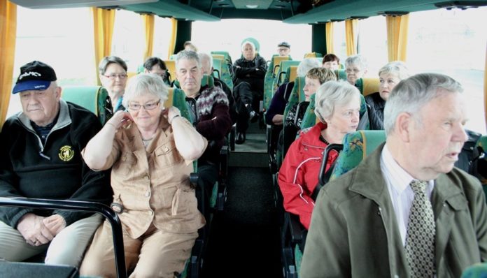 Meðal þátttakenda í ferðinni er Markús Þorkelsson frá Eyrarbakka, sem nú býr á Selfossi. Hann er 95 ára í dag og situr í rútunni á aftasta bekk eins og „töffara“ hefur ætíð verið siður í rútuferðum.