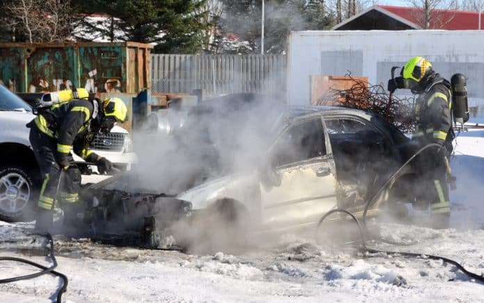 Töluverður eldur var í bílnum og mikinn svartan reyk lagði frá honum. Slökkvistarf gekk vel fyrir sig en fimm slökkviliðsmenn mættu á vettvang ásamt því að lögregla og sjúkrabíll fóru á staðinn.